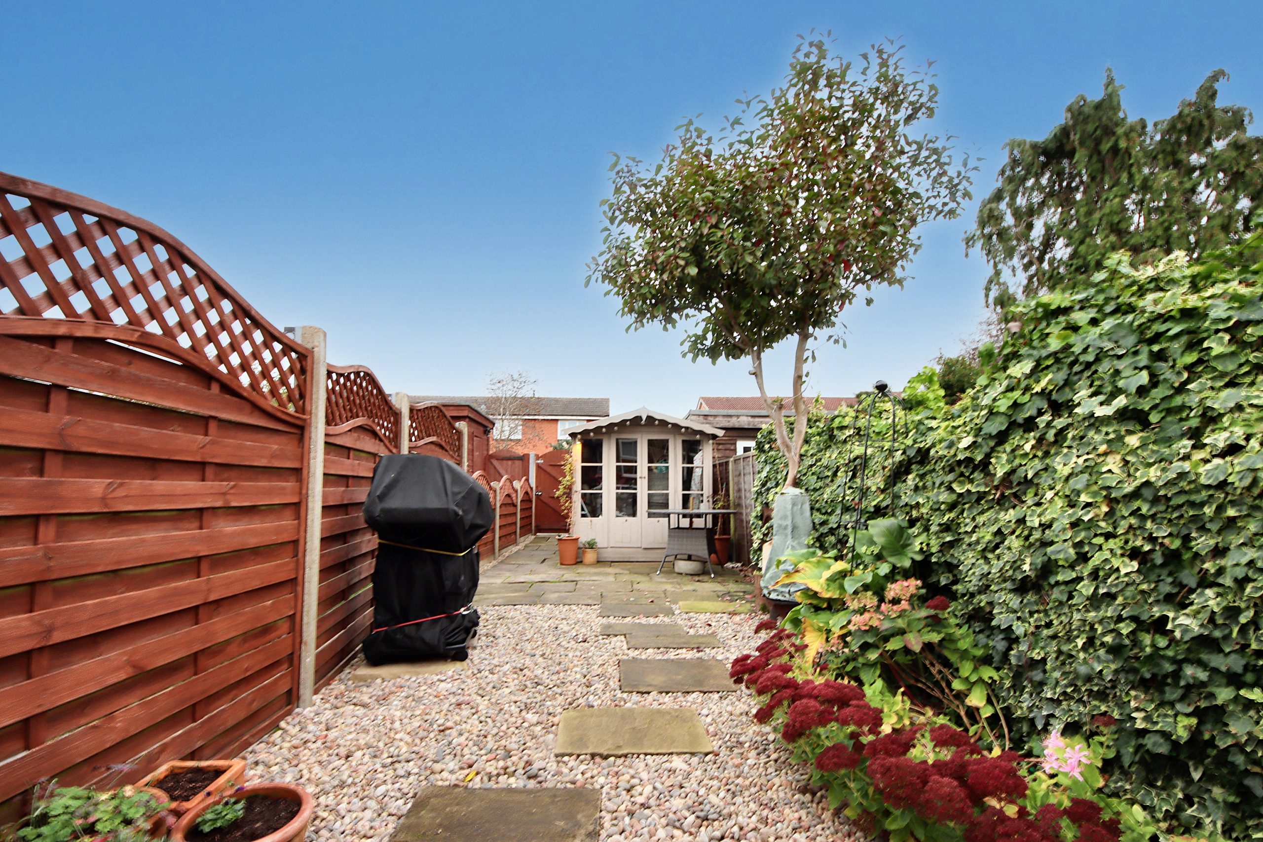 The easterly-facing rear garden extends from the house, leading to a pebbled, low-maintenance area ideal for year-round enjoyment. A garden room, currently used as a shed, provides additional storage, while a rare, dedicated parking space is accessible through a rear gate - an exceptional asset in this sought-after area.