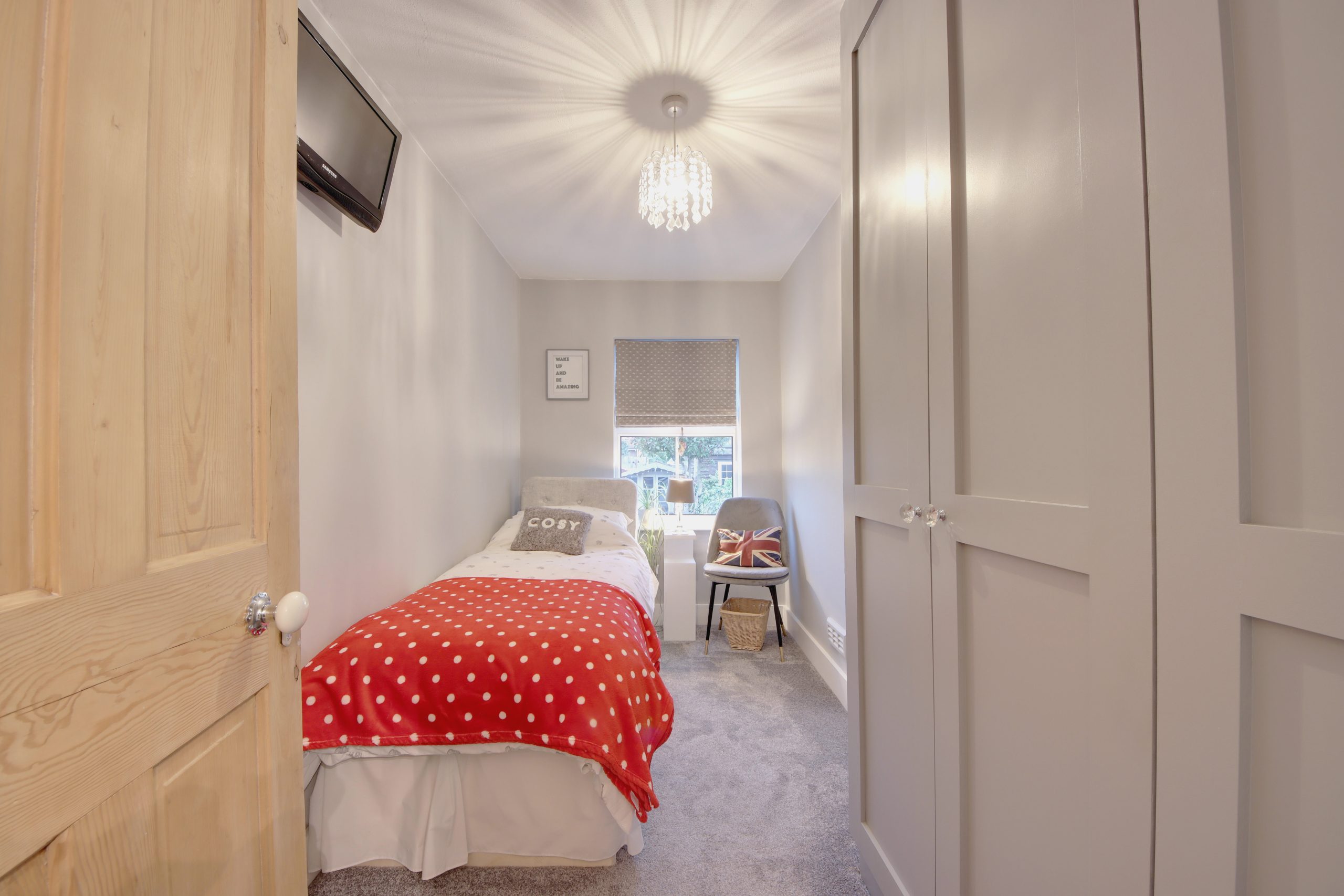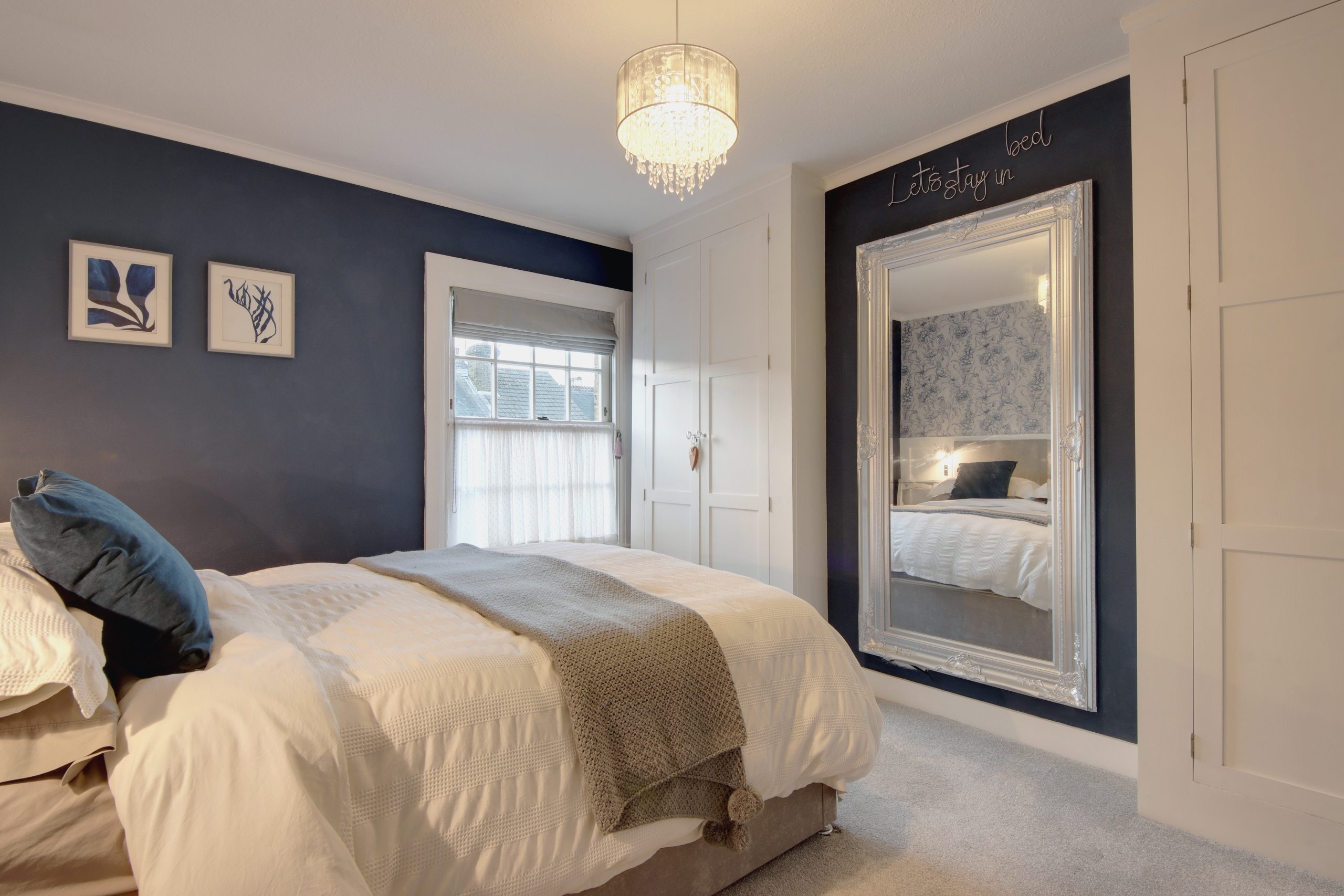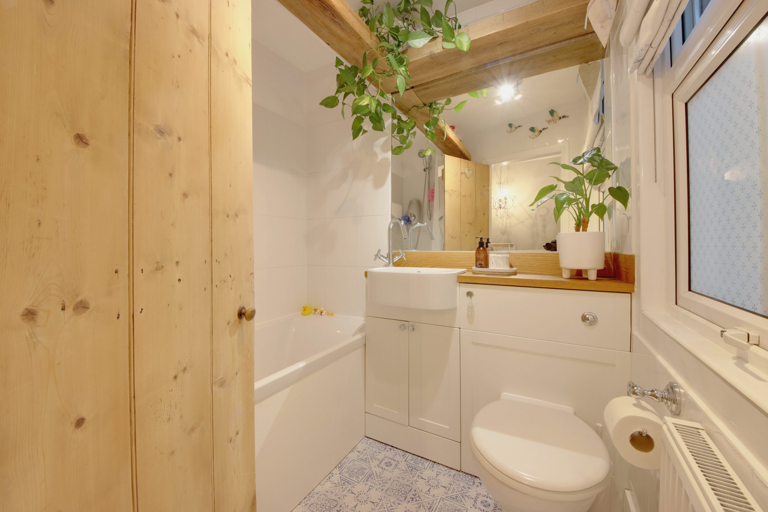 Upstairs, the first floor features two beautifully appointed bedrooms. The primary bedroom is filled with natural light from a large, west-facing sash window and offers ample built-in storage in the alcoves. A playful, wallpapered accent wall hides a ‘secret’ door that leads to a rare private cloakroom, one of two W.C’s on this level. Completing the first floor is a meticulously finished family bathroom, featuring a pristine bathtub, a vessel sink, and overhead timber beams that add both charm and convenient storage.