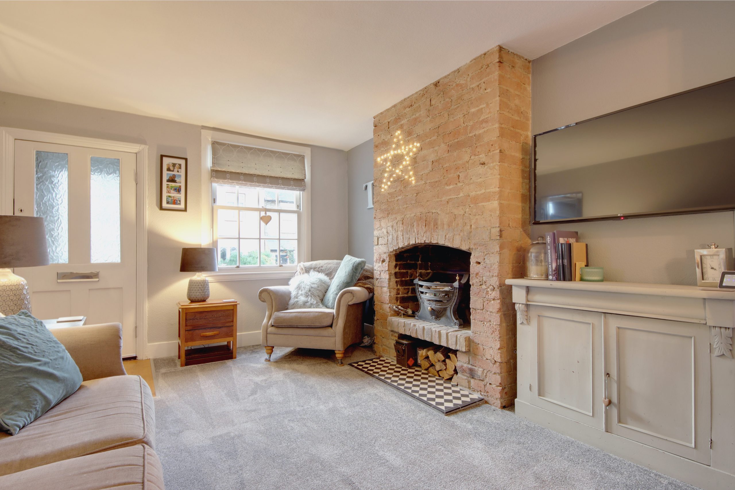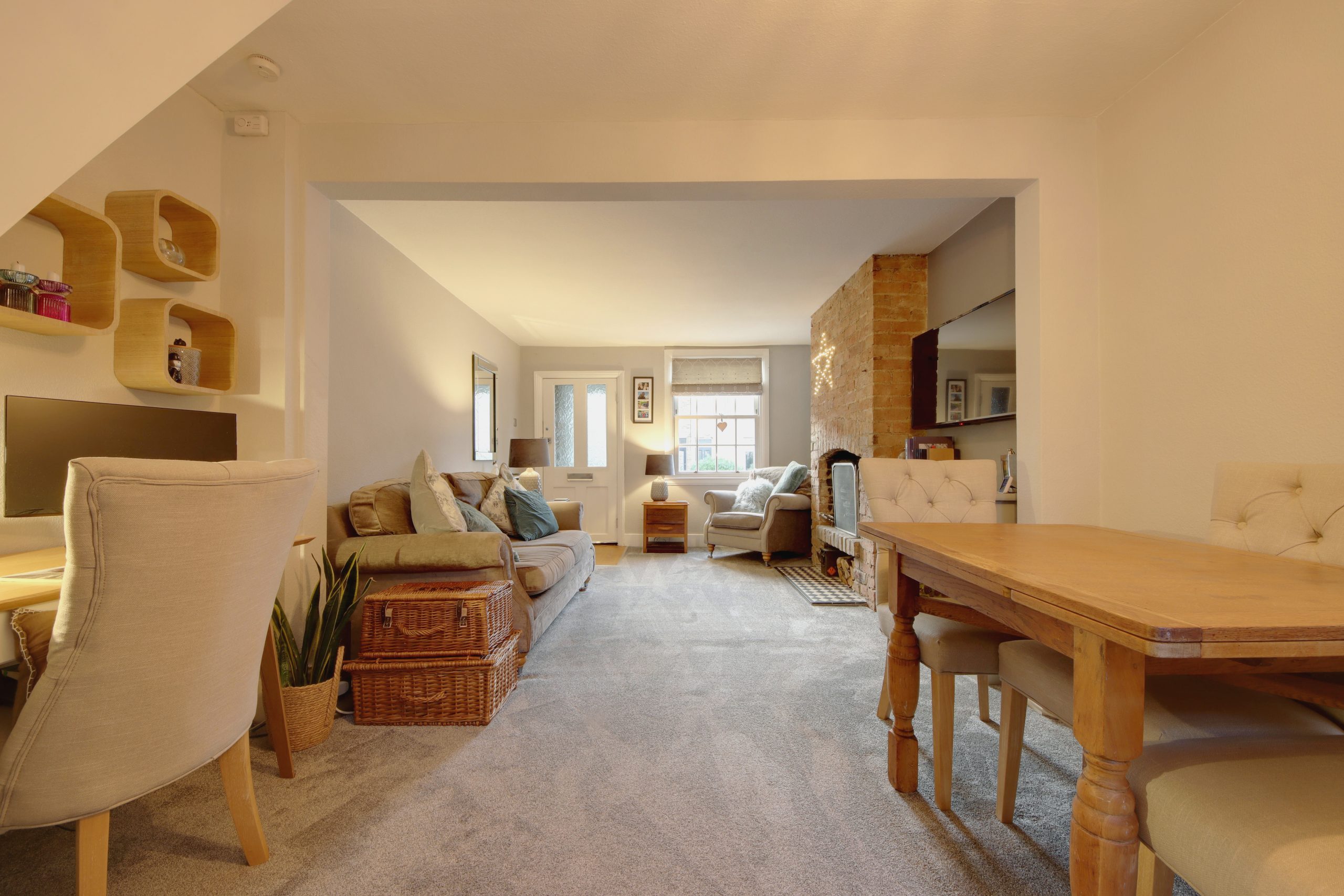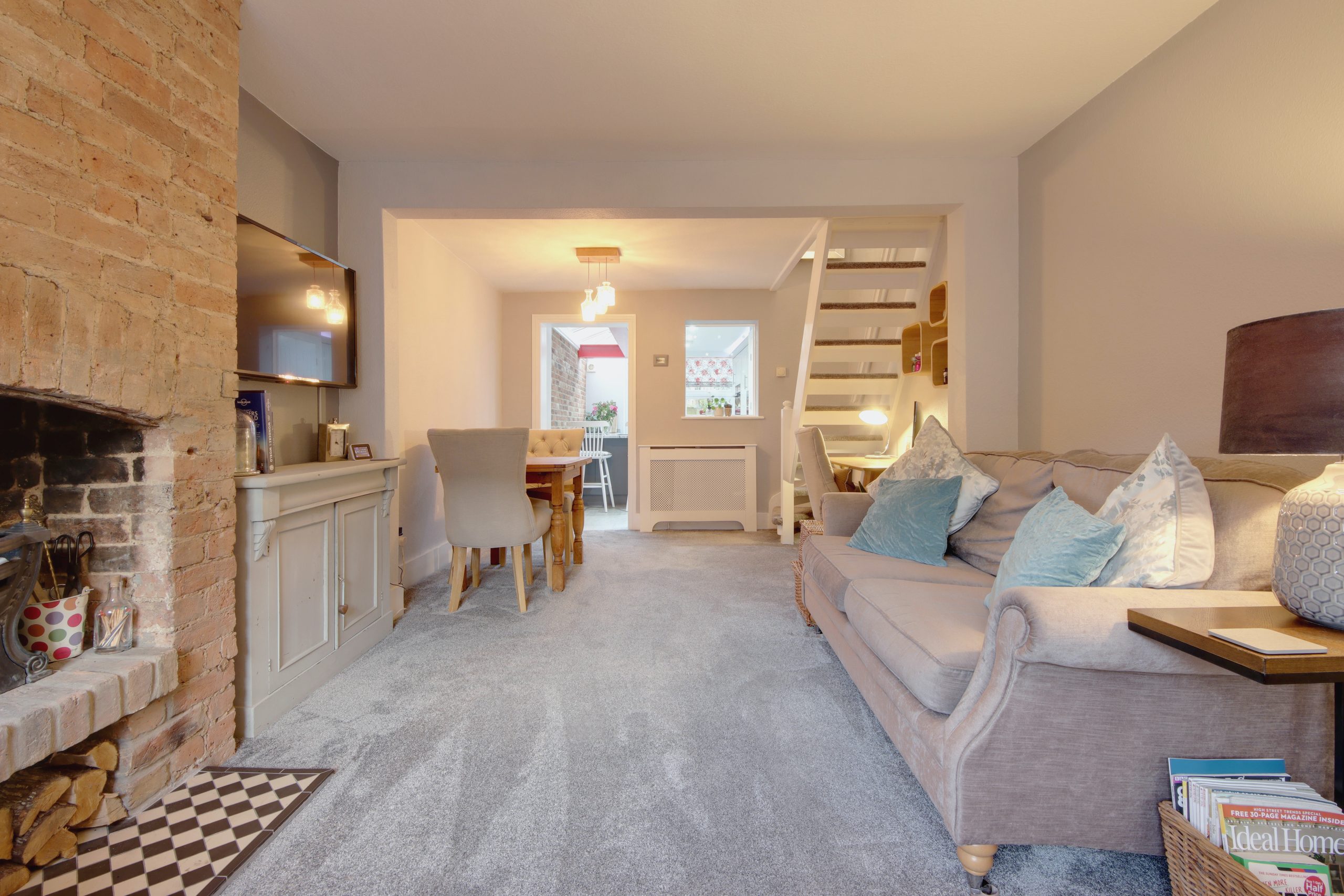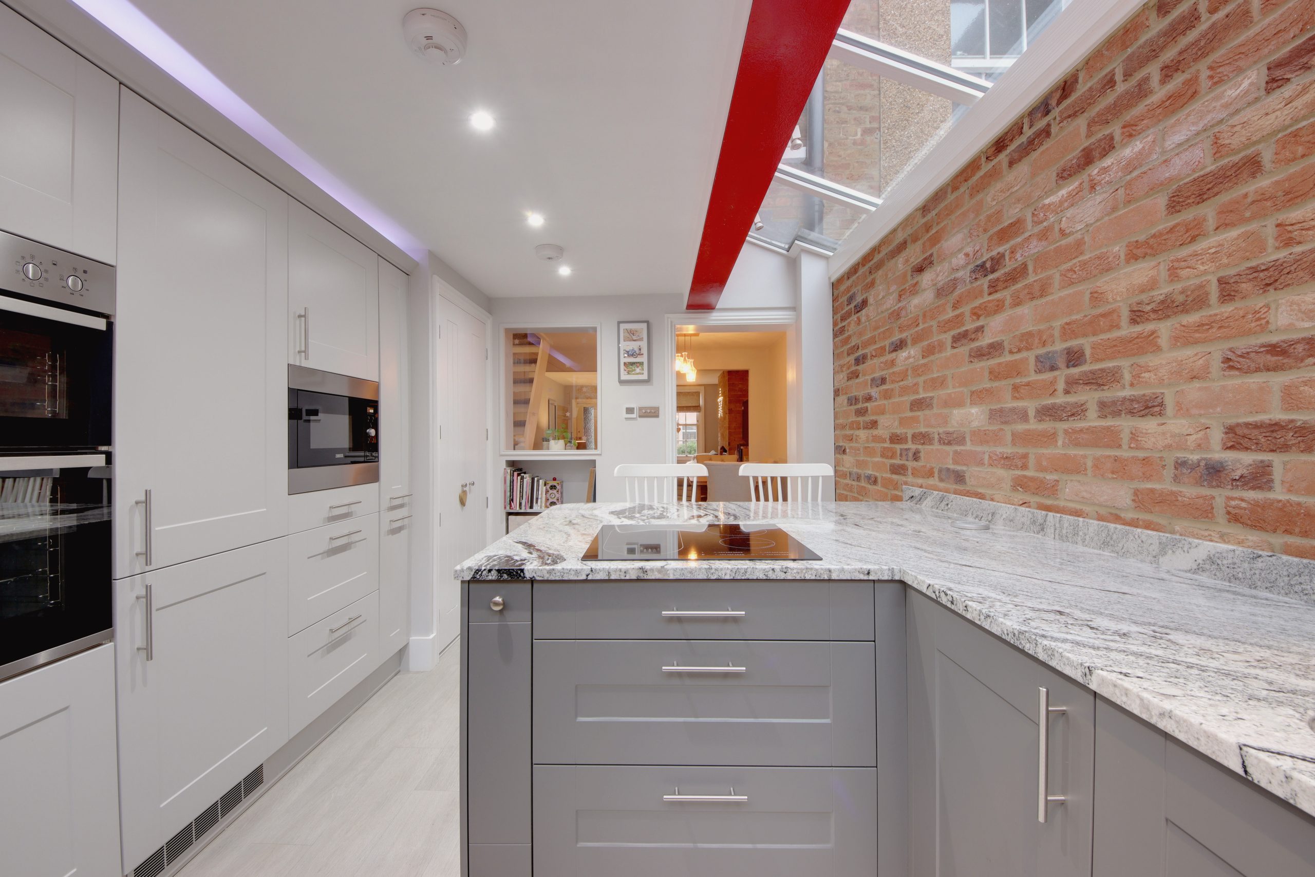 Upon entry, a welcoming porch sets the tone, providing an ideal space to greet guests before entering the impressive living space. The expansive through-lounge, measuring 20’9” x 10’1”, is filled with natural light from dual-aspect glazing that captures both westerly and easterly sunlight. The original, fully-functional fireplace stands as a centerpiece, enhancing the room's warmth and charm year-round. Towards the rear, the kitchen is a masterpiece of modern design with an eye for detail and functionality. Cabinets line the right wall, housing built-in appliances, including a microwave and oven-grill, arranged thoughtfully for ease. The granite worktops, personally selected by the owner from Denham quarry, bring a unique touch, while the exposed, post-box red RSJ beneath a wraparound skylight adds a pop of modern style.