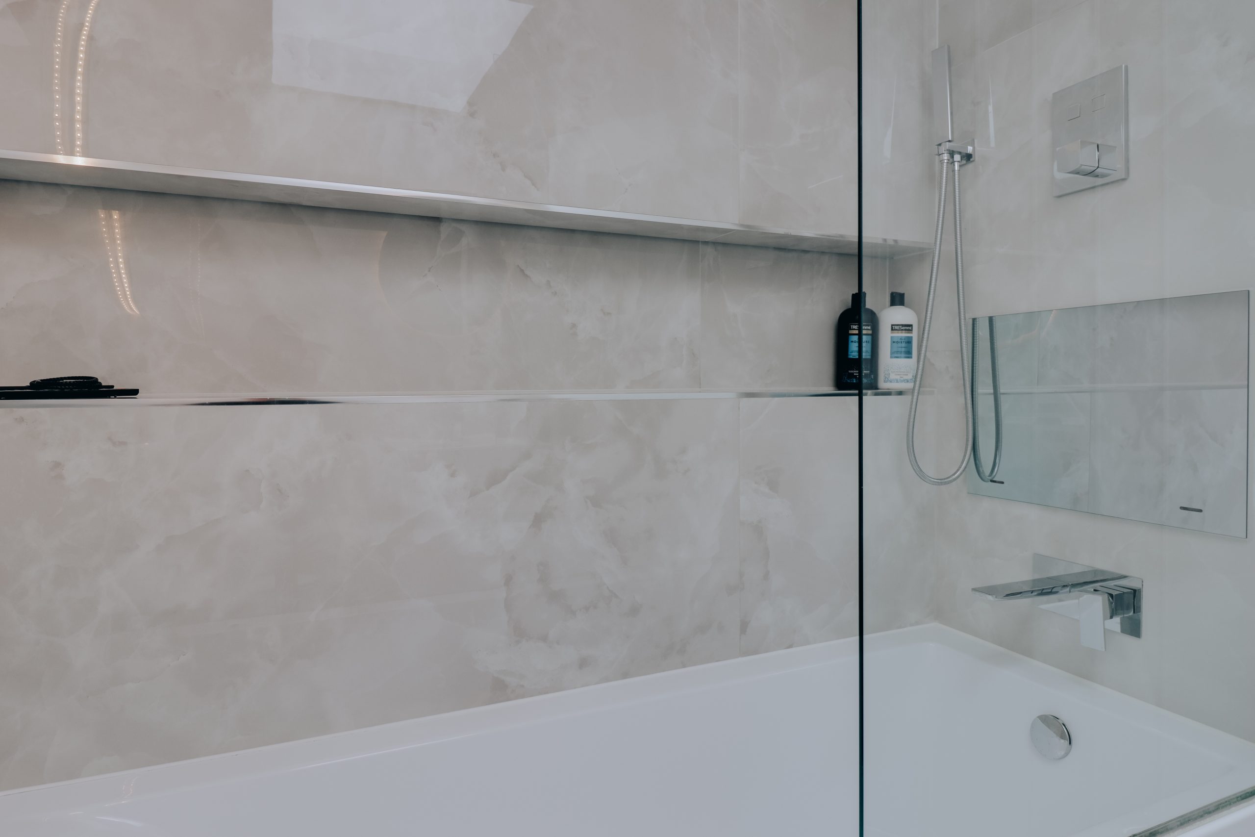 Upstairs, two generous double bedrooms maintain the home’s refined tone. Each features inbuilt cabinetry, designed for both form and function, and crisp white blinds for privacy. The bathroom feels like a private retreat - large-format grey tiles and a statement bathtub with a mirrored TV screen, all working harmoniously to create a space that’s part luxury suite, part sanctuary.