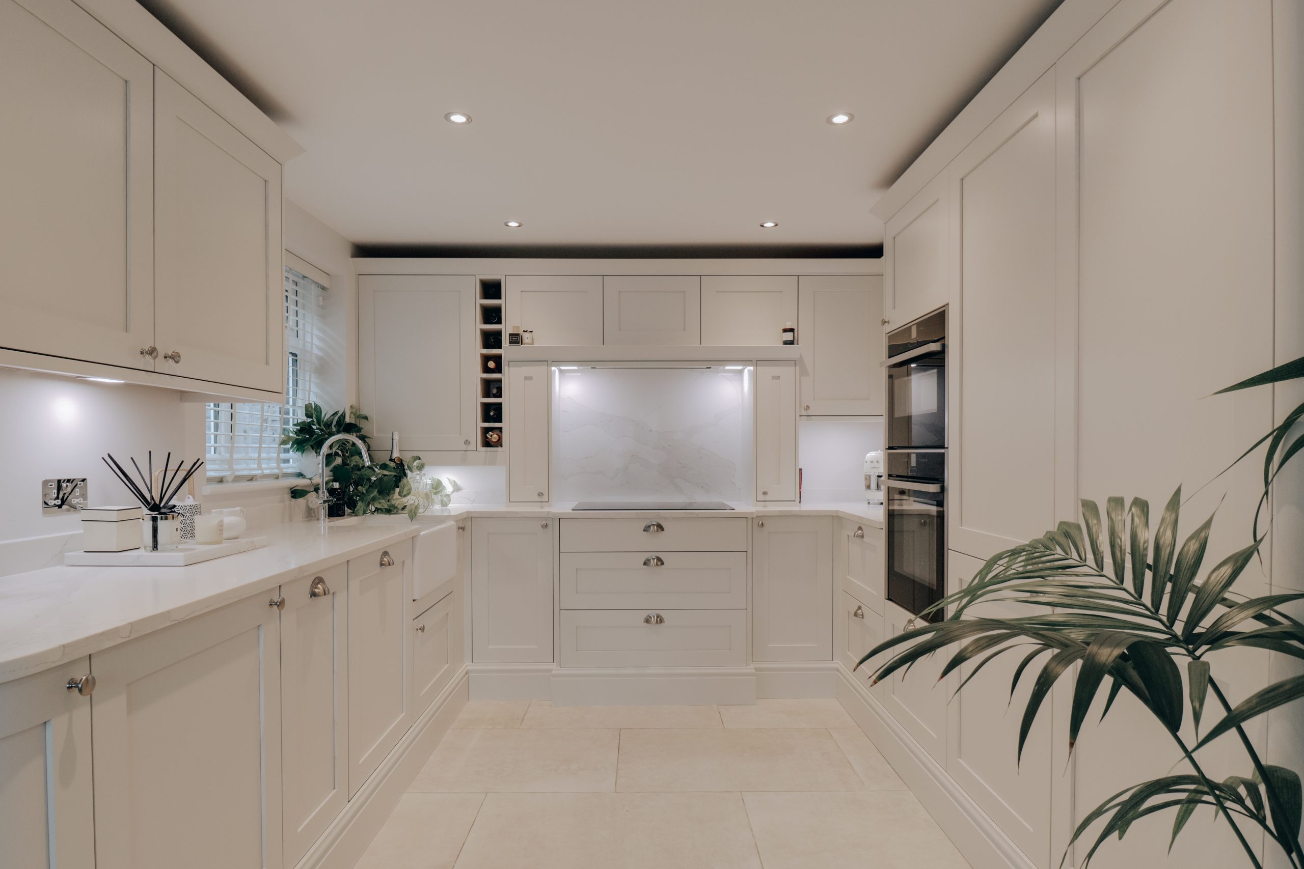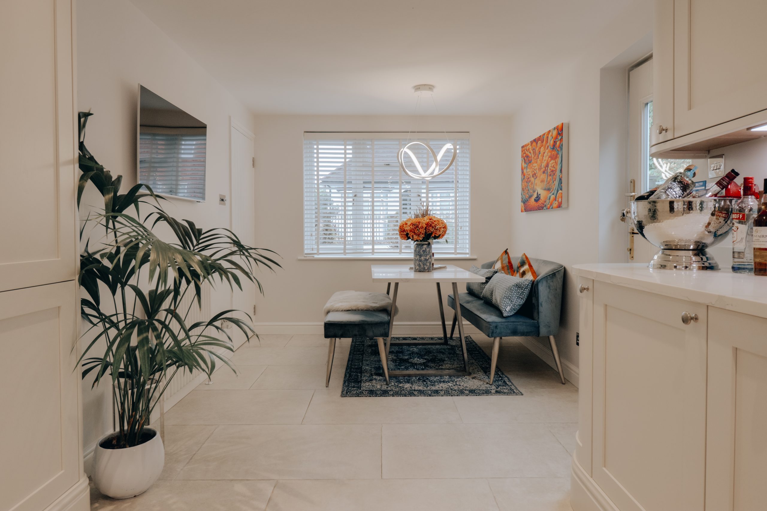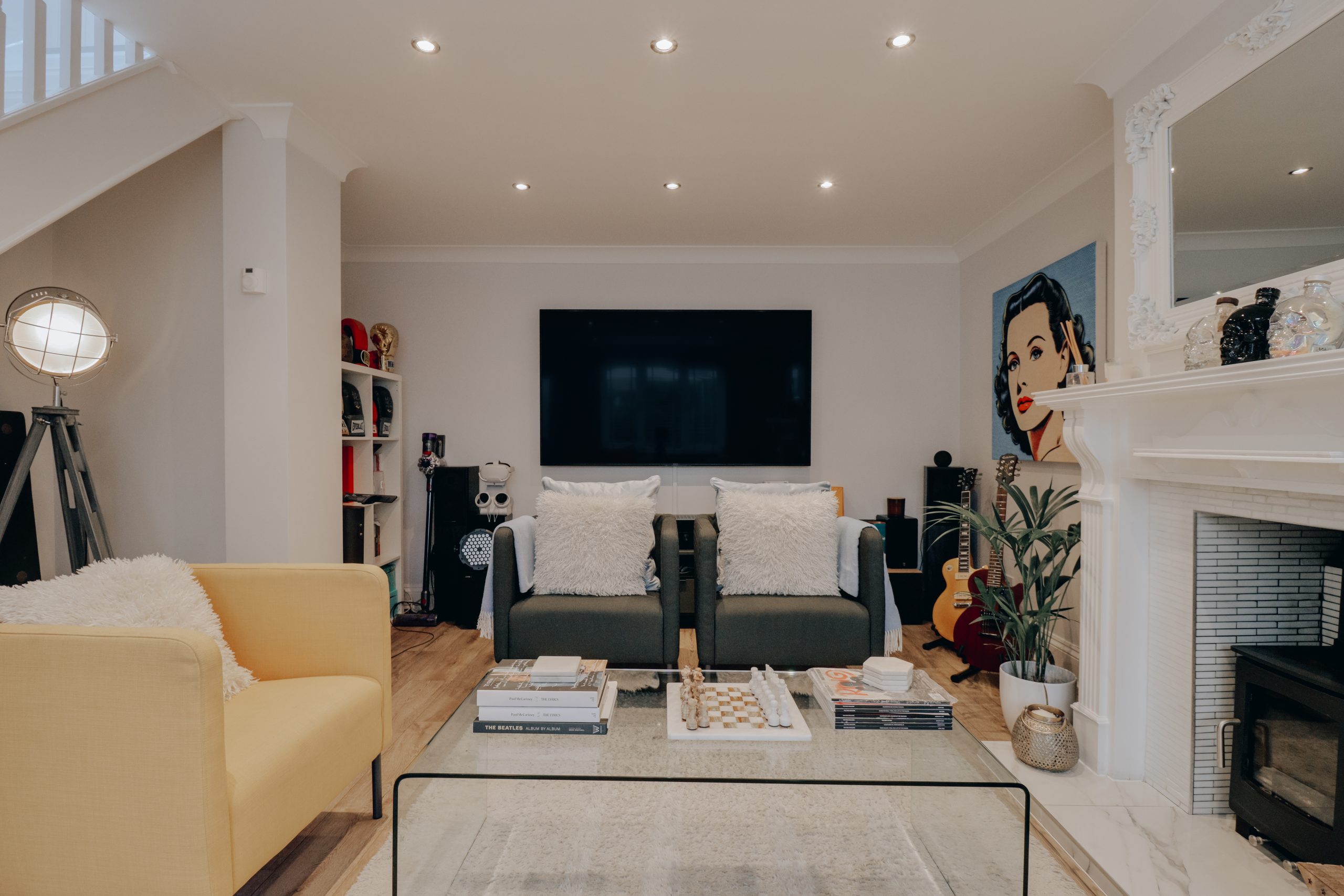 Inside, the home opens up with intention. The main living space (25'3" x 12'10") is striking in scale and bathed in natural light. The palette is restrained; clean white walls, neutral-toned flooring allowing the home to breathe and adapt to its contents, be it art, furniture, or the movement of light throughout the day. A freestanding log burner anchors the room, while a sculptural staircase draws the eye upward, framed by a first-floor skylight. The kitchen is nothing short of exceptional. U-shaped and intelligently zoned, it stretches across the rear wall and is finished with precision: sleek cabinetry, a flush-mounted induction hob with recessed extractor and immaculate quartz worktops. It’s effortlessly functional, and the kind of kitchen where every detail has been considered, and none overdone. A dining area by the window offers the perfect spot to gather, flowing out via a rear door to a sunlit garden terrace - private, peaceful and beautifully orientated.