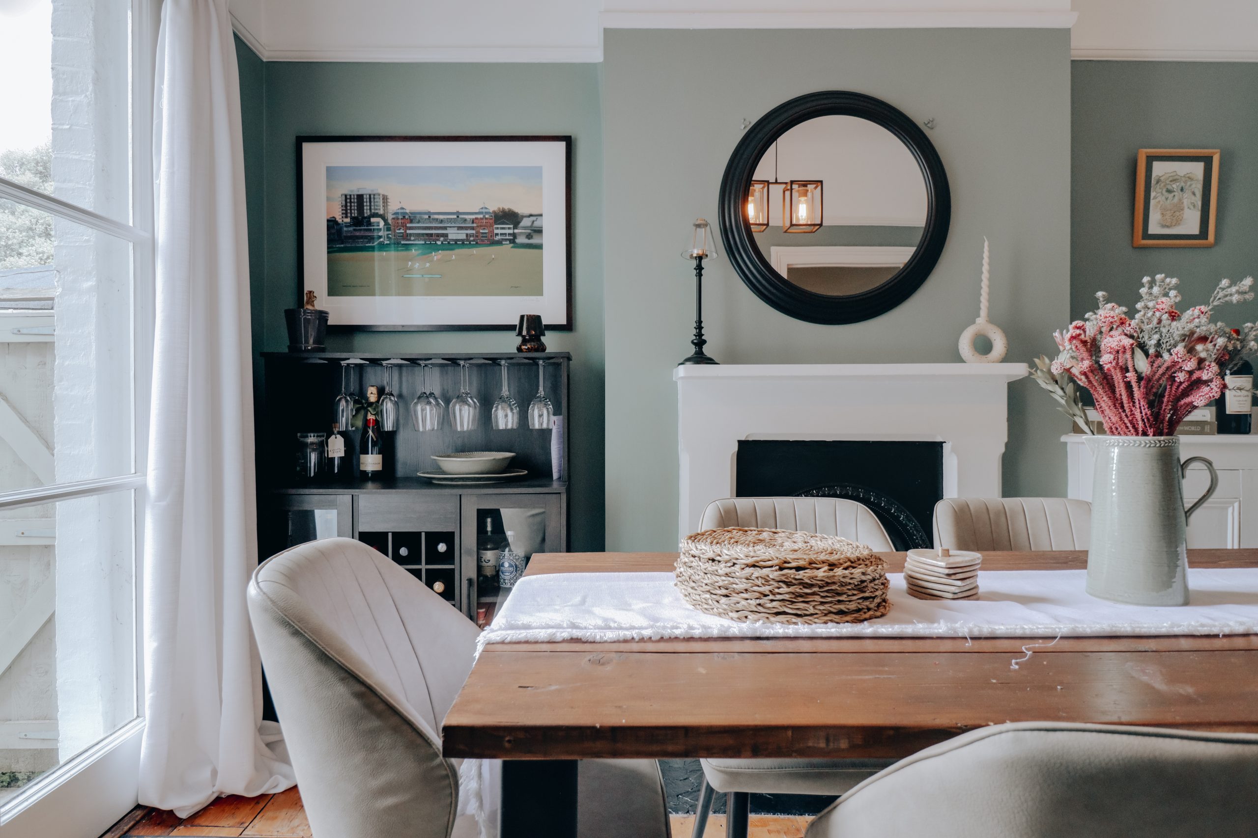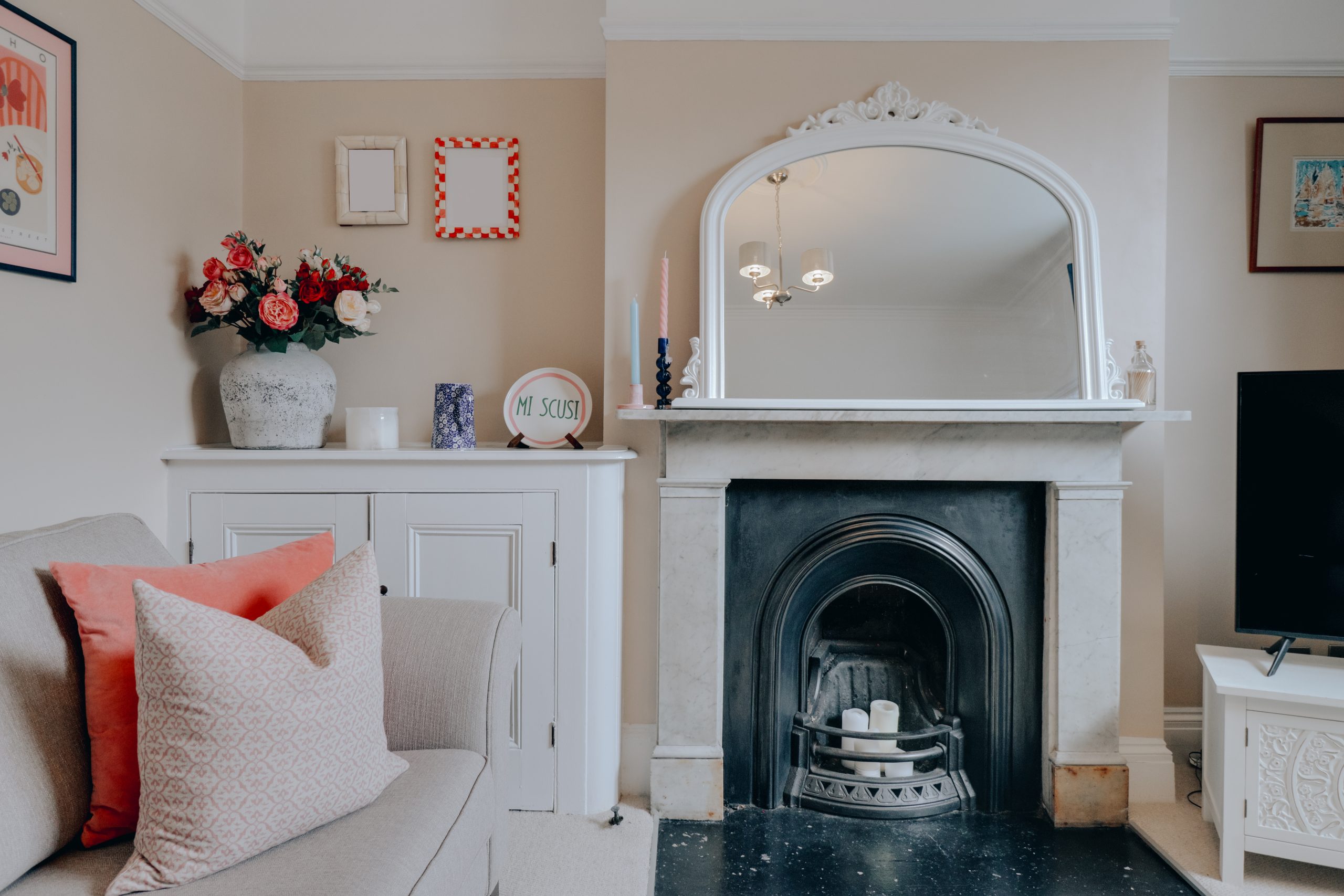 Inside, the home is equally captivating. A spacious hallway sets the tone, leading to an impeccably presented living room (12’9” x 12’5”). Here, soft neutral carpeting, a bold chimney breast, a traditional column radiator, and refined cornicing combine to create a room that is both welcoming and refined. Flooded with natural light, it’s a tranquil space to unwind or entertain. At the rear, the open-plan kitchen and breakfast room is the showpiece of the home - a visually stunning and highly practical space designed to impress. A feature exposed brick wall and arched window house a breakfast and stools, while extensive wraparound worktops are ideal for both culinary creativity and everyday living. A Rangemaster five-burner gas hob, brushed chrome finishes, a farmhouse sink, and a soft muted colour palette all contribute to an atmosphere of contemporary country elegance.