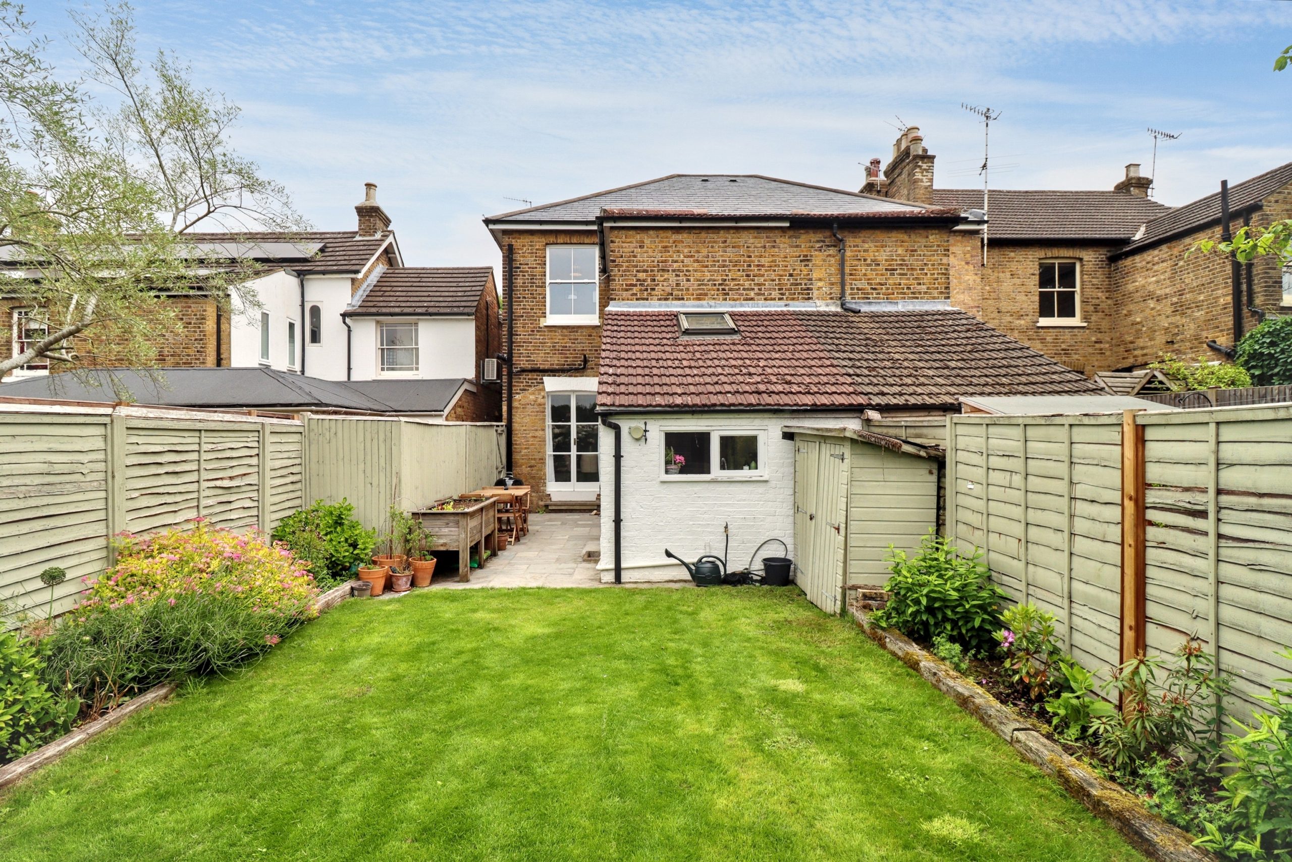 The westerly-facing rear garden is a beautifully landscaped escape, starting with a spacious, levelled patio ideal for outdoor dining and lounging. Sleeper-framed beds introduce texture and greenery, leading to a manicured lawn perfect for sunny afternoons, children’s play, or relaxed entertaining.