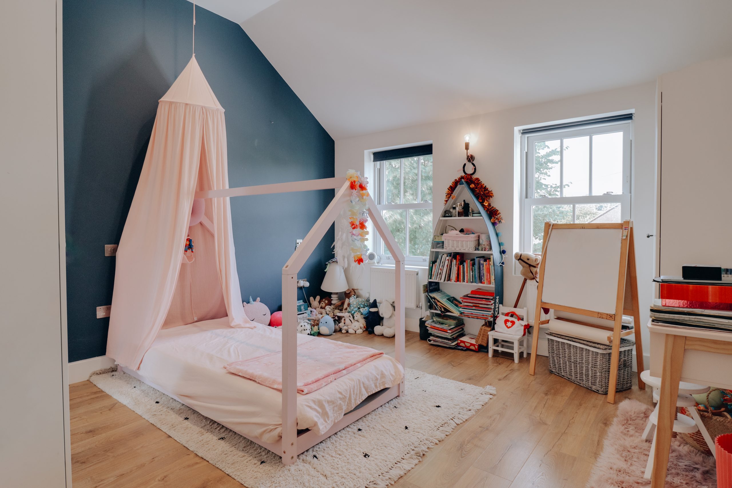 Stylish wood flooring, character chimney breast and striking teal-glazed rear feature.