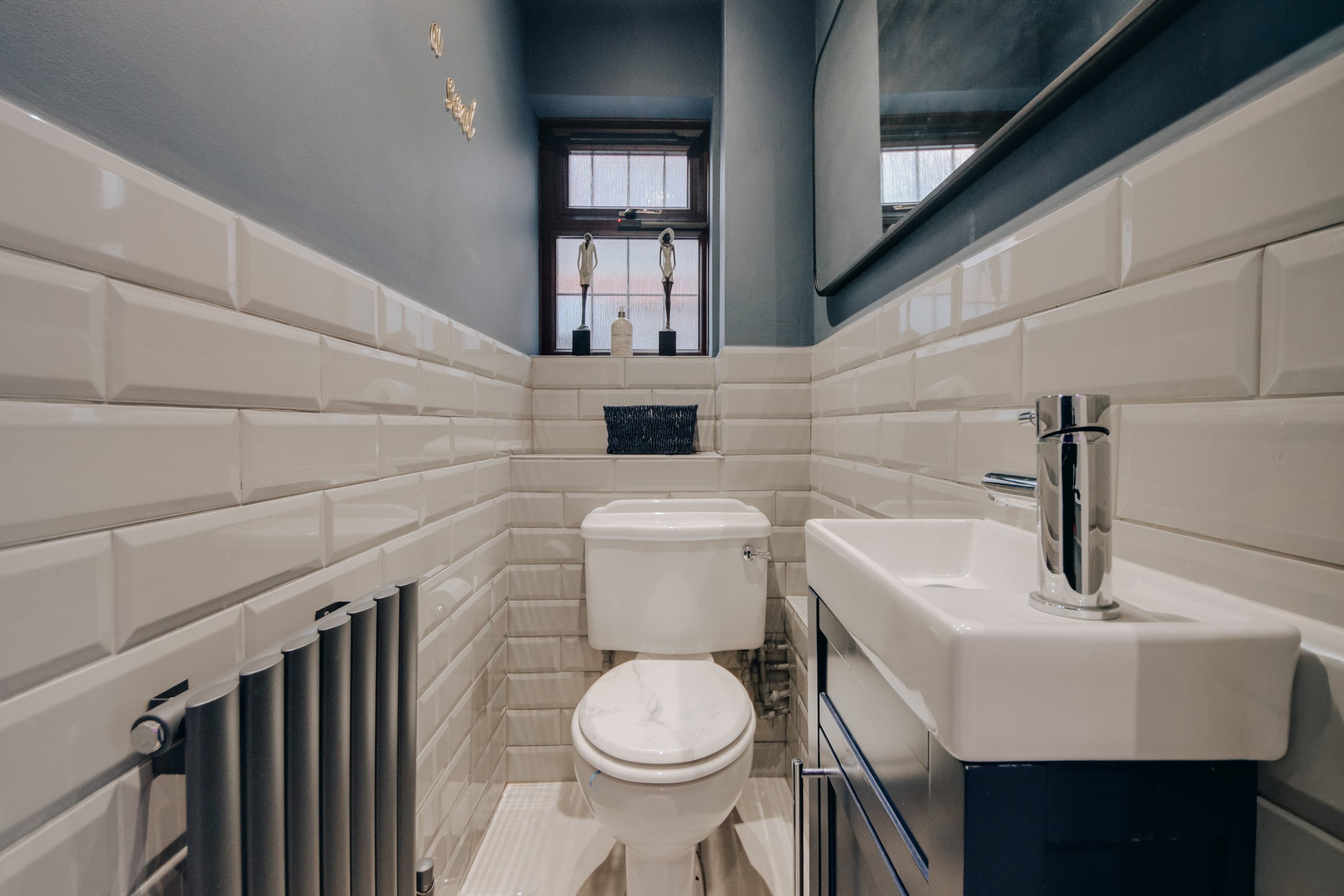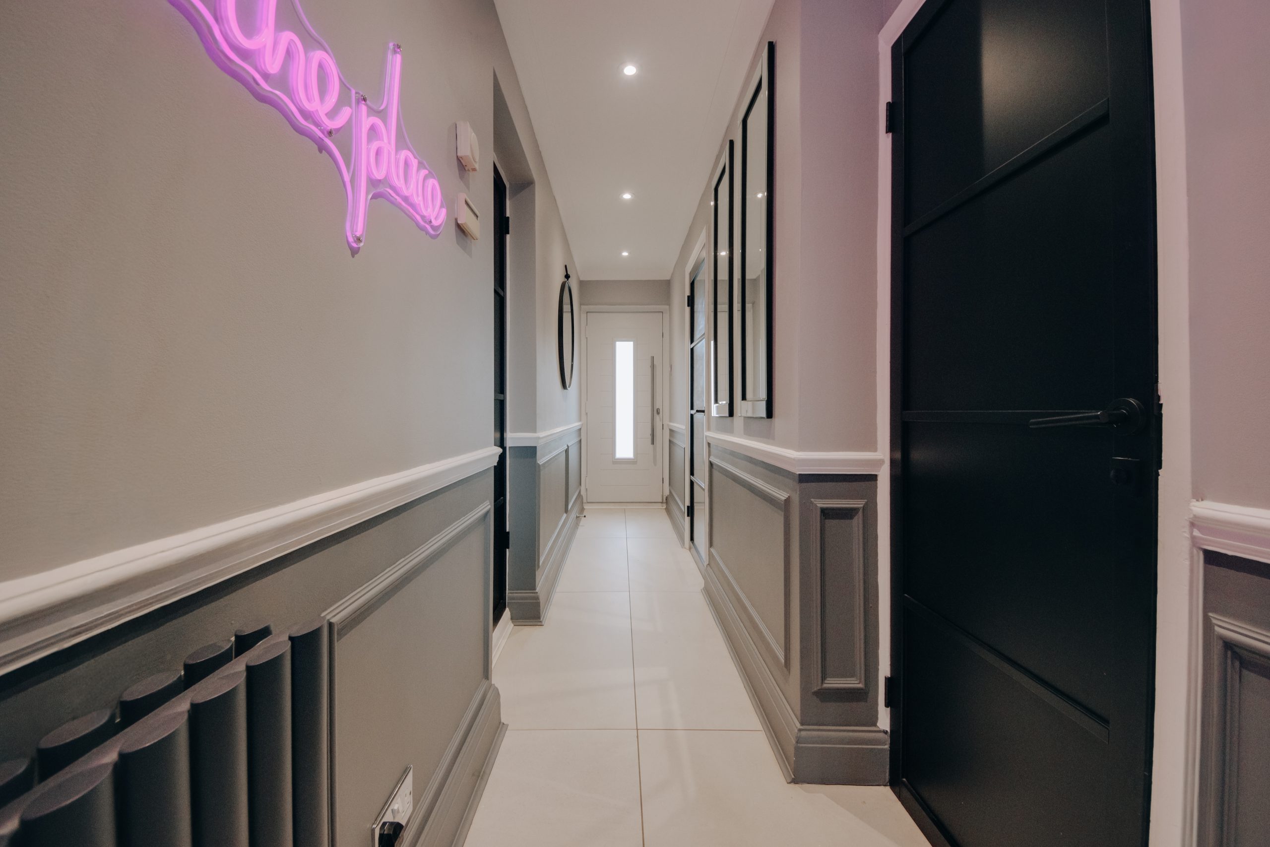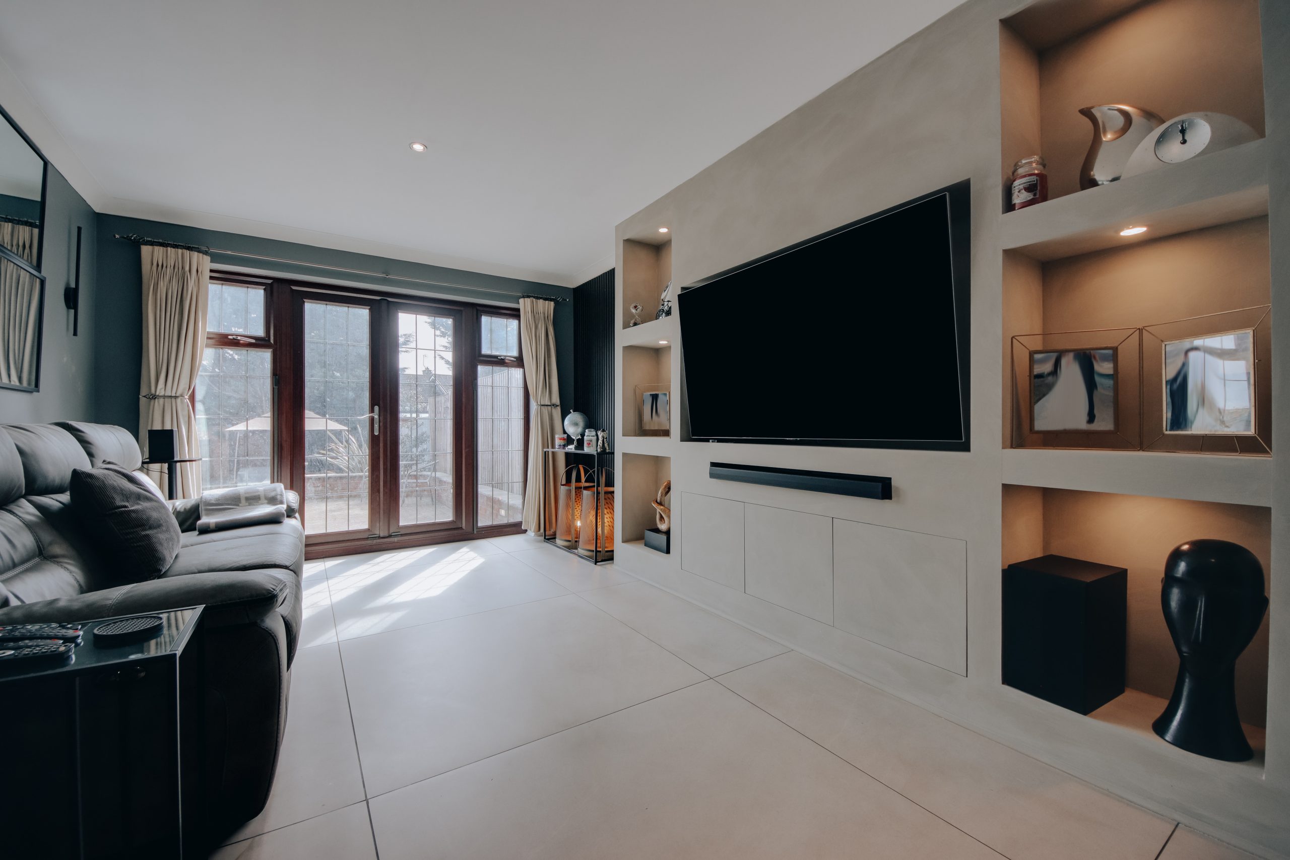 Inside, a wide entrance hall sets the tone from the outset. Clean architectural lines and carefully introduced wall panelling establish a sense of calm that carries through every room. The ground floor has been intelligently reconfigured into a fluid, versatile arrangement, well suited to modern family life without sacrificing a sense of order. To the front, a dedicated dining room captures the evening light through its north-westerly aspect, offering a deliberate remove from the main living spaces. The former garage has been thoughtfully converted into a beauty studio, a versatile room that already functions beautifully in its current form, though the simple removal of a stud wall would restore it to its original configuration. For the eventual occupier, it represents a genuine wealth of opportunity: a home office, studio, playroom, or additional reception. To the rear, the living room and kitchen both open onto the garden, together forming the social heart of the home. The living room, approximately 19'1" x 10'8", is anchored by a feature media wall framed by contemporary black acoustic panelling, with oversized neutral tiling underfoot, a space that feels composed and unhurried. The kitchen continues the same design language with conviction: bold blue cabinetry, a bespoke tiled splashback, integrated LED detailing, and a suite of premium appliances. A guest cloakroom sits discreetly off the hallway, completing the ground floor with quiet practicality. Upstairs, four well-proportioned bedrooms are finished with the same care found below, served by a luxurious family bathroom. The principal bedroom, measuring 12'5" x 10'9", is accompanied by its own en-suite shower room, a private and considered retreat.
