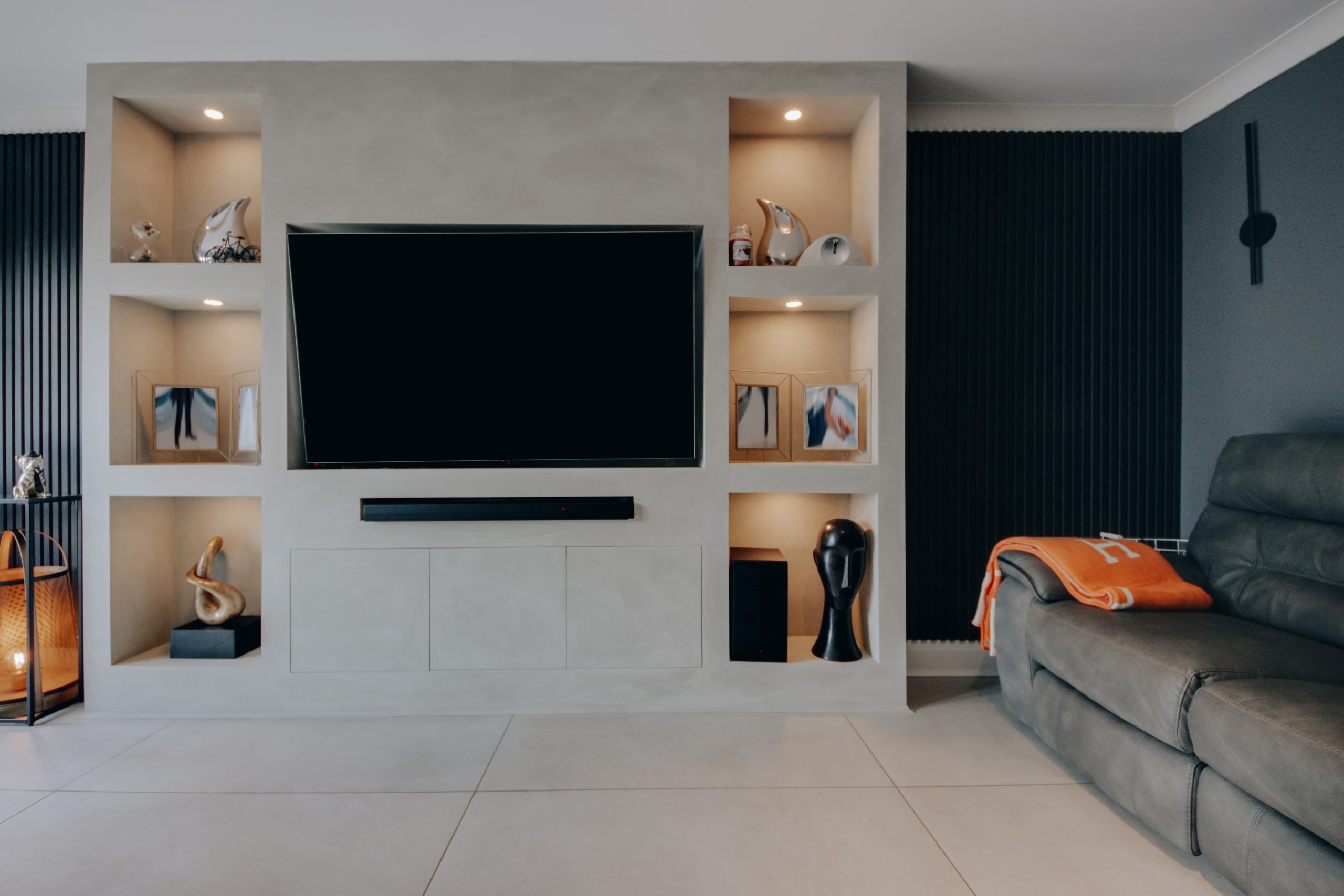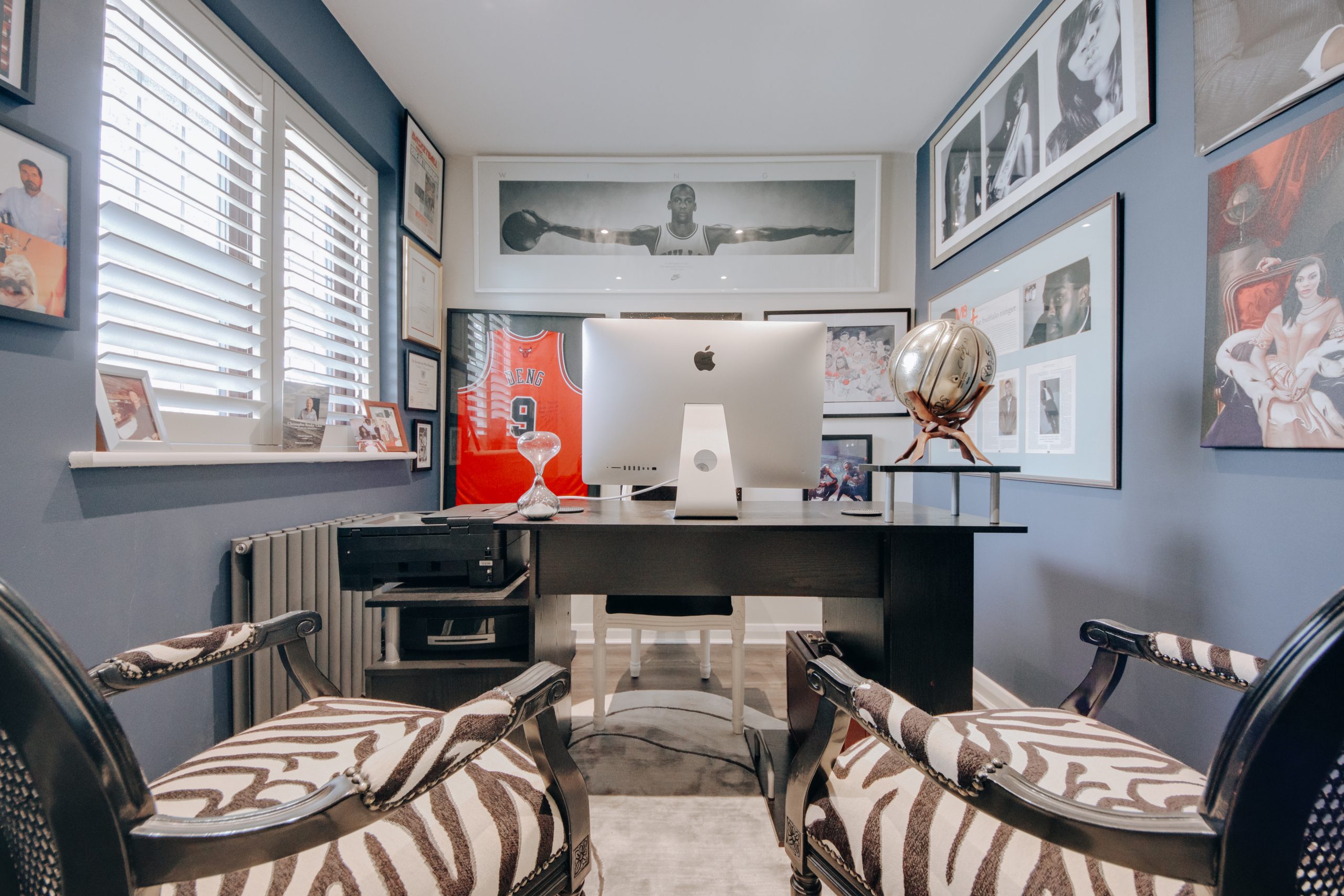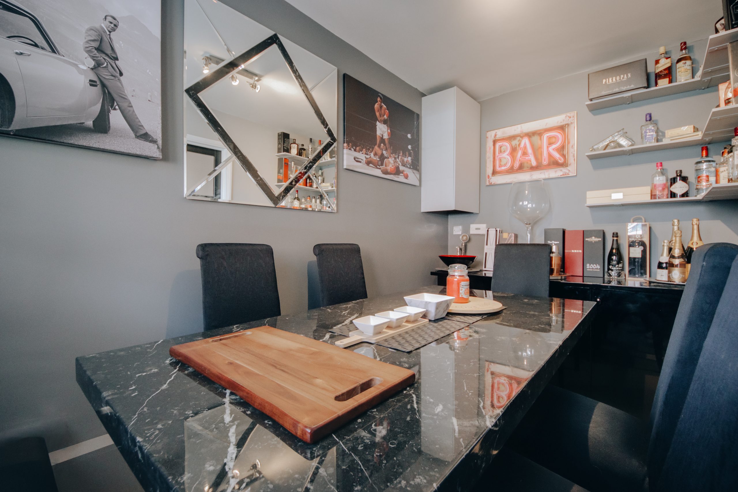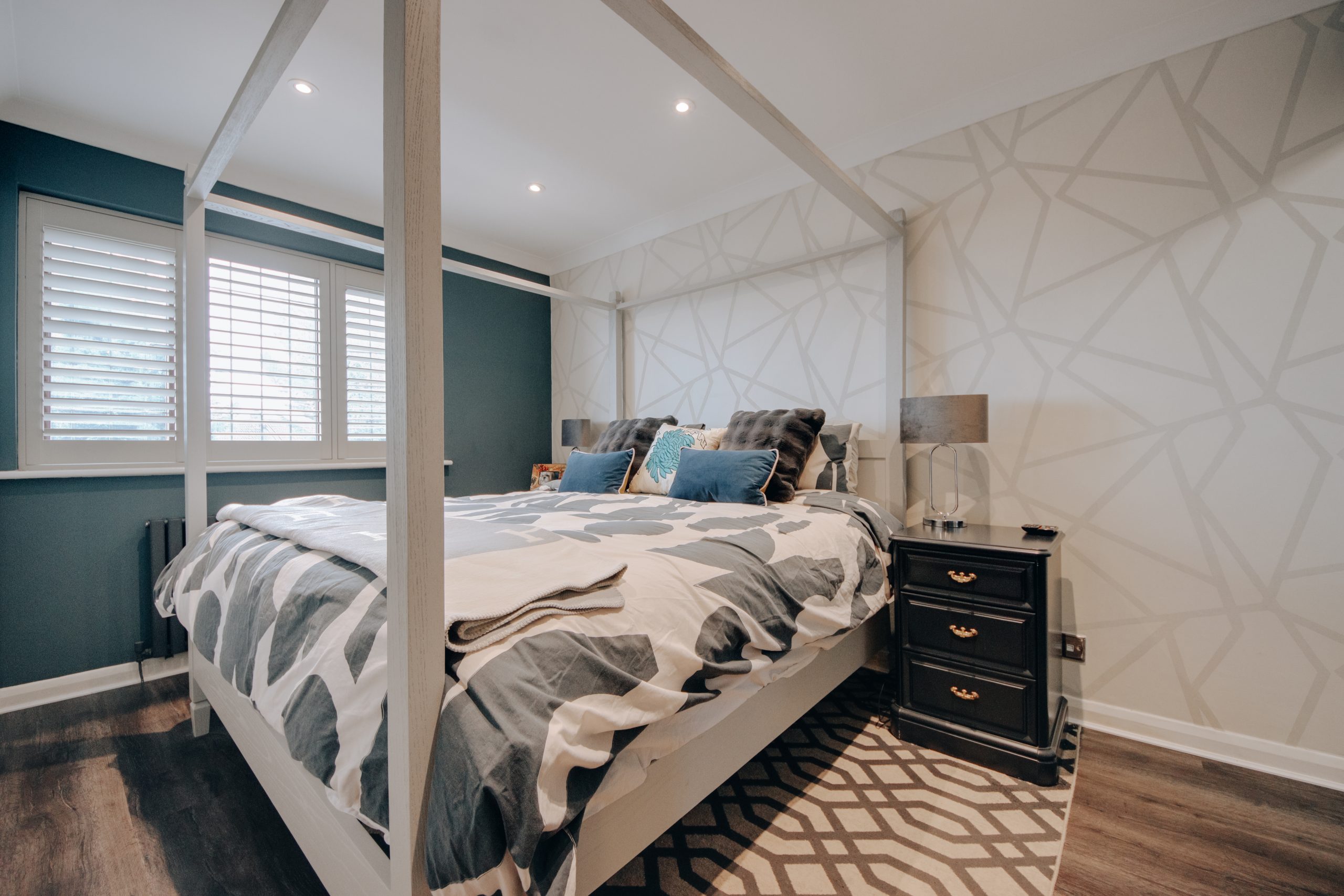 Inside, a wide entrance hall sets the tone from the outset. Clean architectural lines and carefully introduced wall panelling establish a sense of calm that carries through every room. The ground floor has been intelligently reconfigured into a fluid, versatile arrangement, well suited to modern family life without sacrificing a sense of order. To the front, a dedicated dining room captures the evening light through its north-westerly aspect, offering a deliberate remove from the main living spaces. The former garage has been thoughtfully converted into a beauty studio, a versatile room that already functions beautifully in its current form, though the simple removal of a stud wall would restore it to its original configuration. For the eventual occupier, it represents a genuine wealth of opportunity: a home office, studio, playroom, or additional reception. To the rear, the living room and kitchen both open onto the garden, together forming the social heart of the home. The living room, approximately 19'1" x 10'8", is anchored by a feature media wall framed by contemporary black acoustic panelling, with oversized neutral tiling underfoot, a space that feels composed and unhurried. The kitchen continues the same design language with conviction: bold blue cabinetry, a bespoke tiled splashback, integrated LED detailing, and a suite of premium appliances. A guest cloakroom sits discreetly off the hallway, completing the ground floor with quiet practicality. Upstairs, four well-proportioned bedrooms are finished with the same care found below, served by a luxurious family bathroom. The principal bedroom, measuring 12'5" x 10'9", is accompanied by its own en-suite shower room, a private and considered retreat.