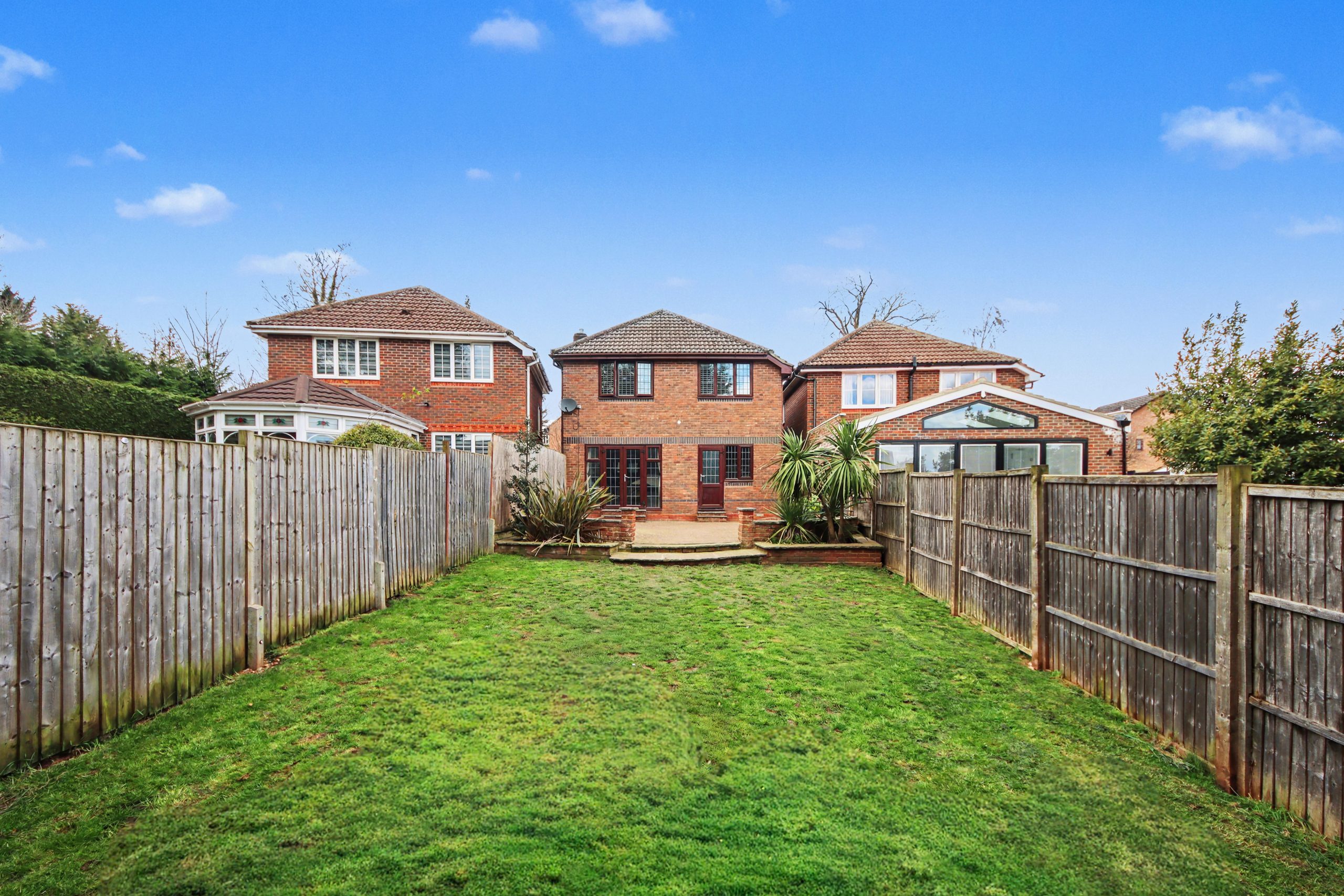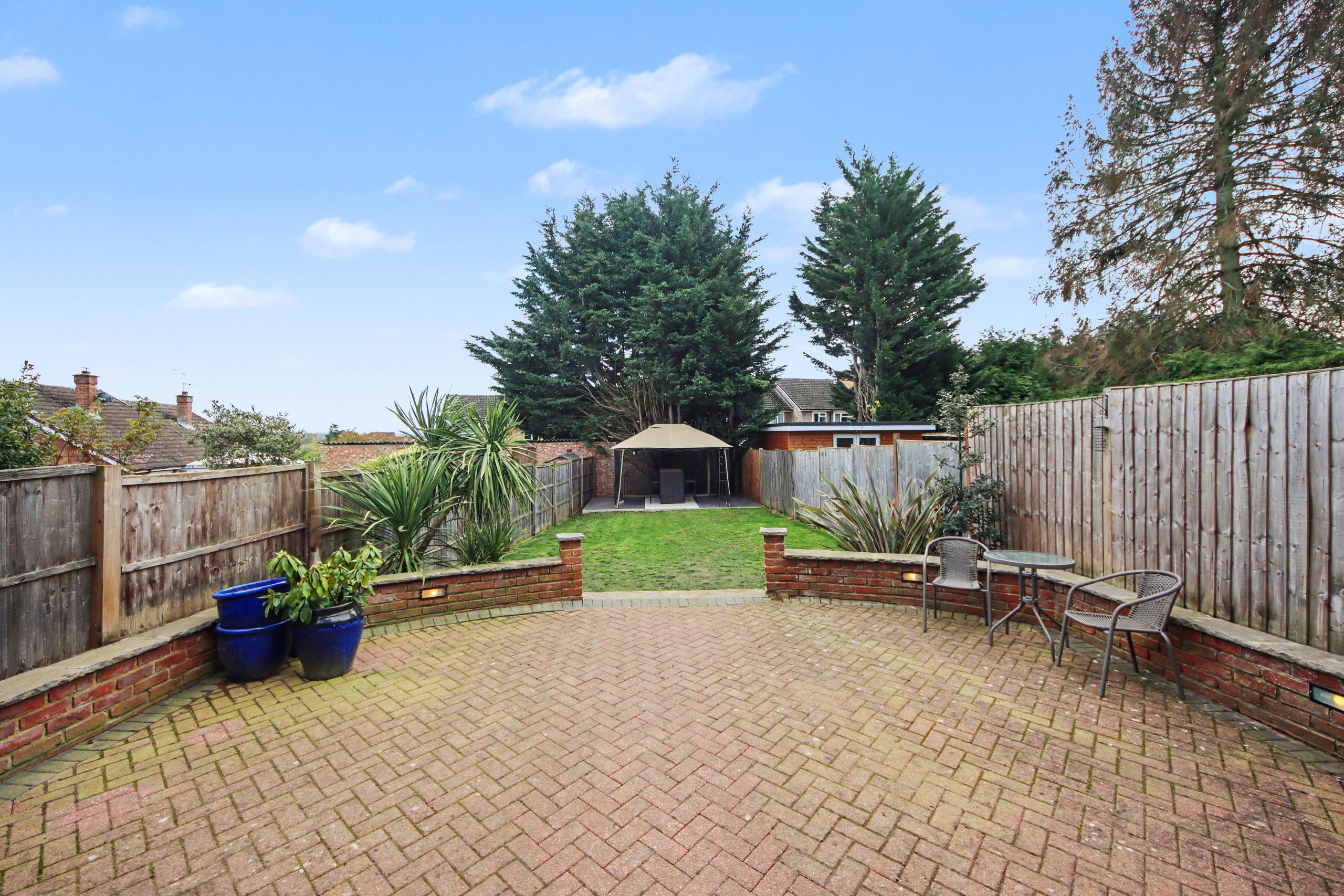 Outside, the south-easterly rear garden enjoys a generous aspect and has been designed for both ease and enjoyment. A neatly maintained lawn is complemented by a dedicated patio area, creating a versatile setting for outdoor dining and summer entertaining.