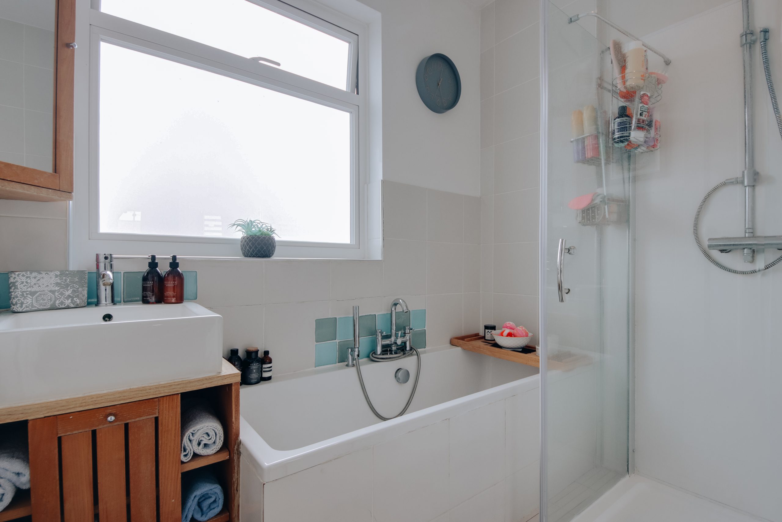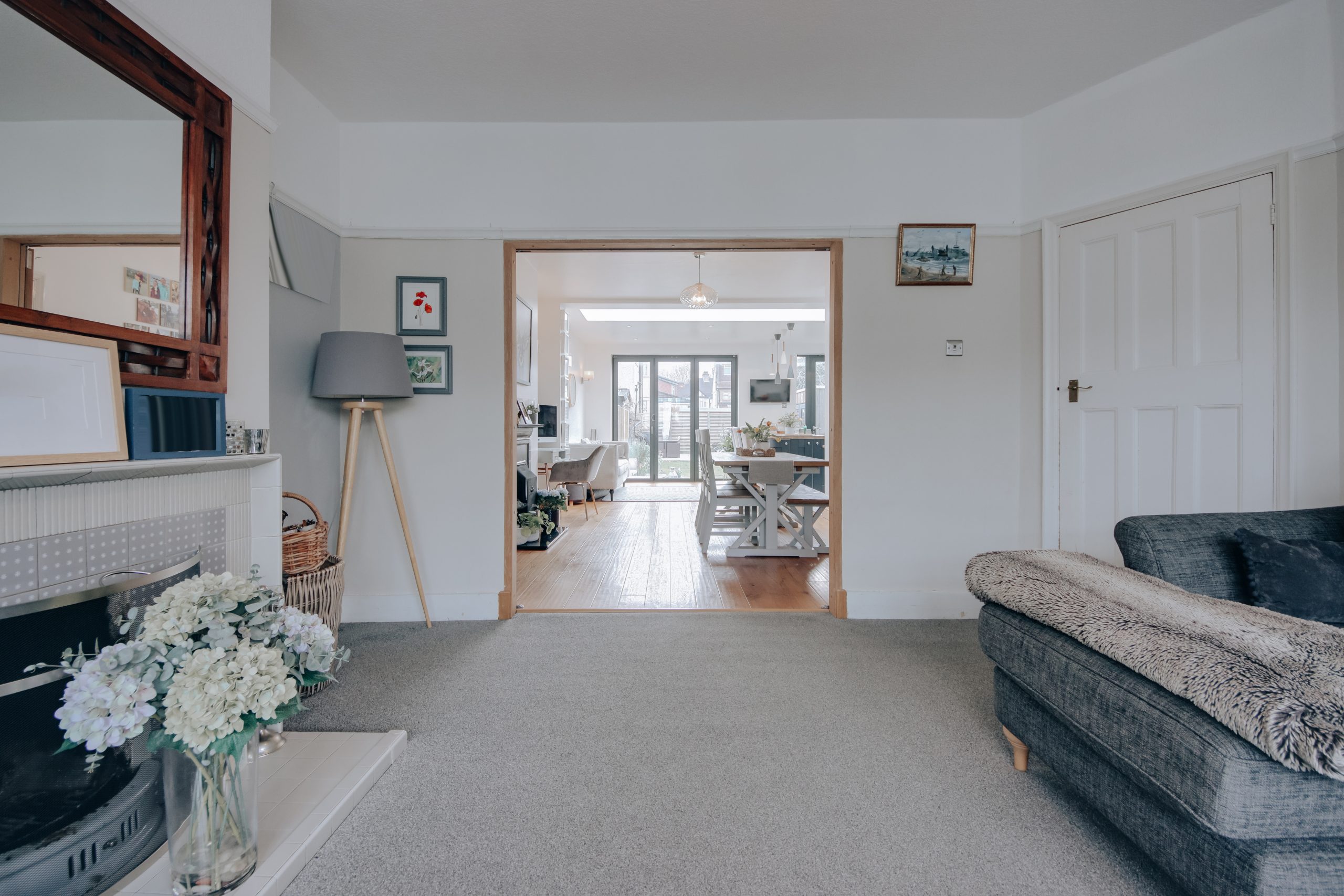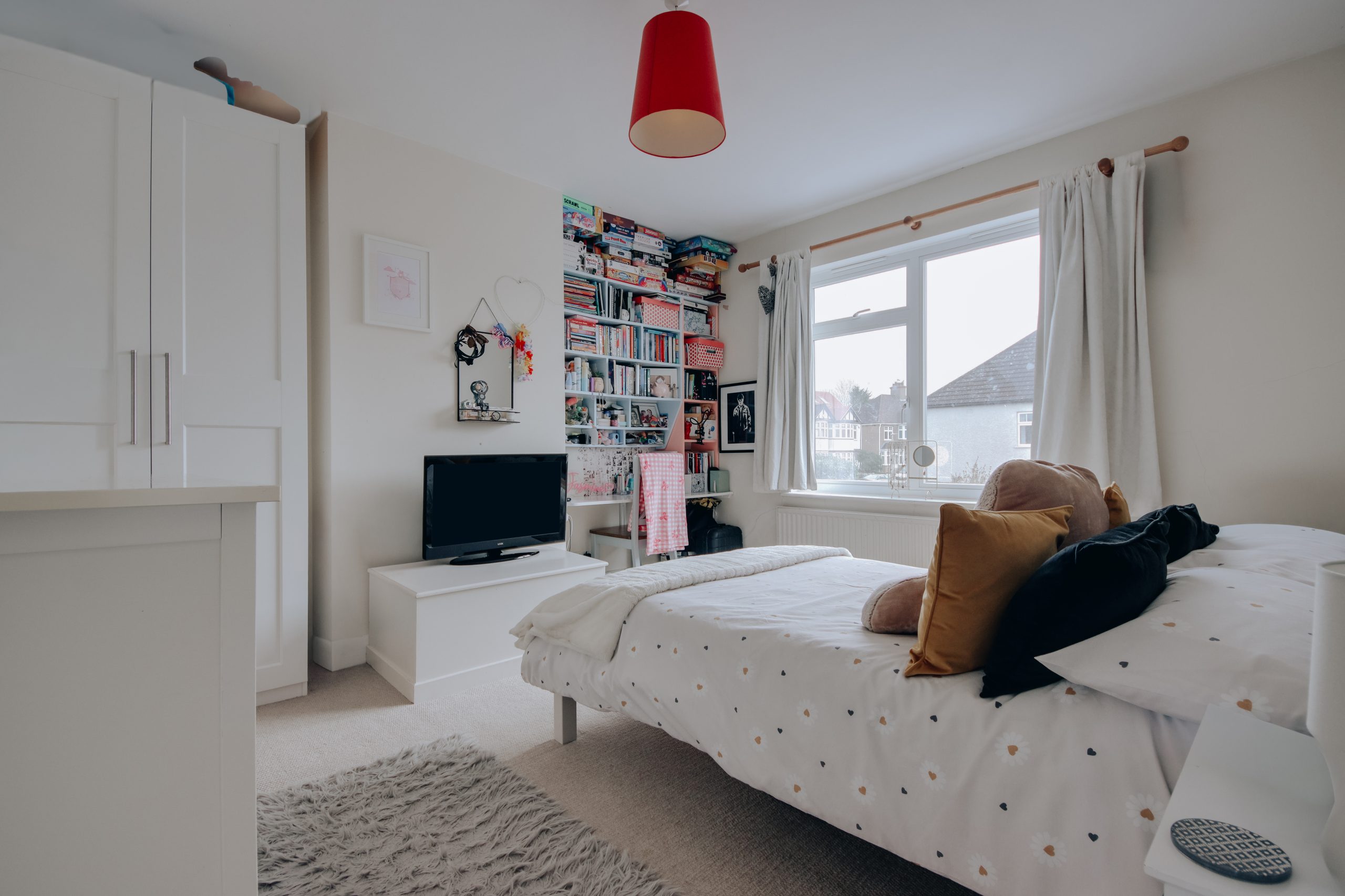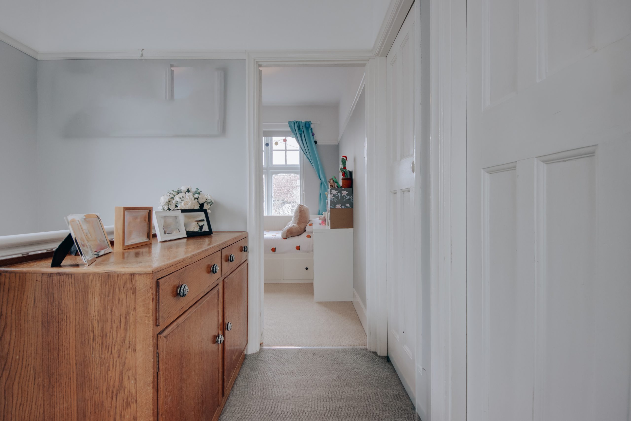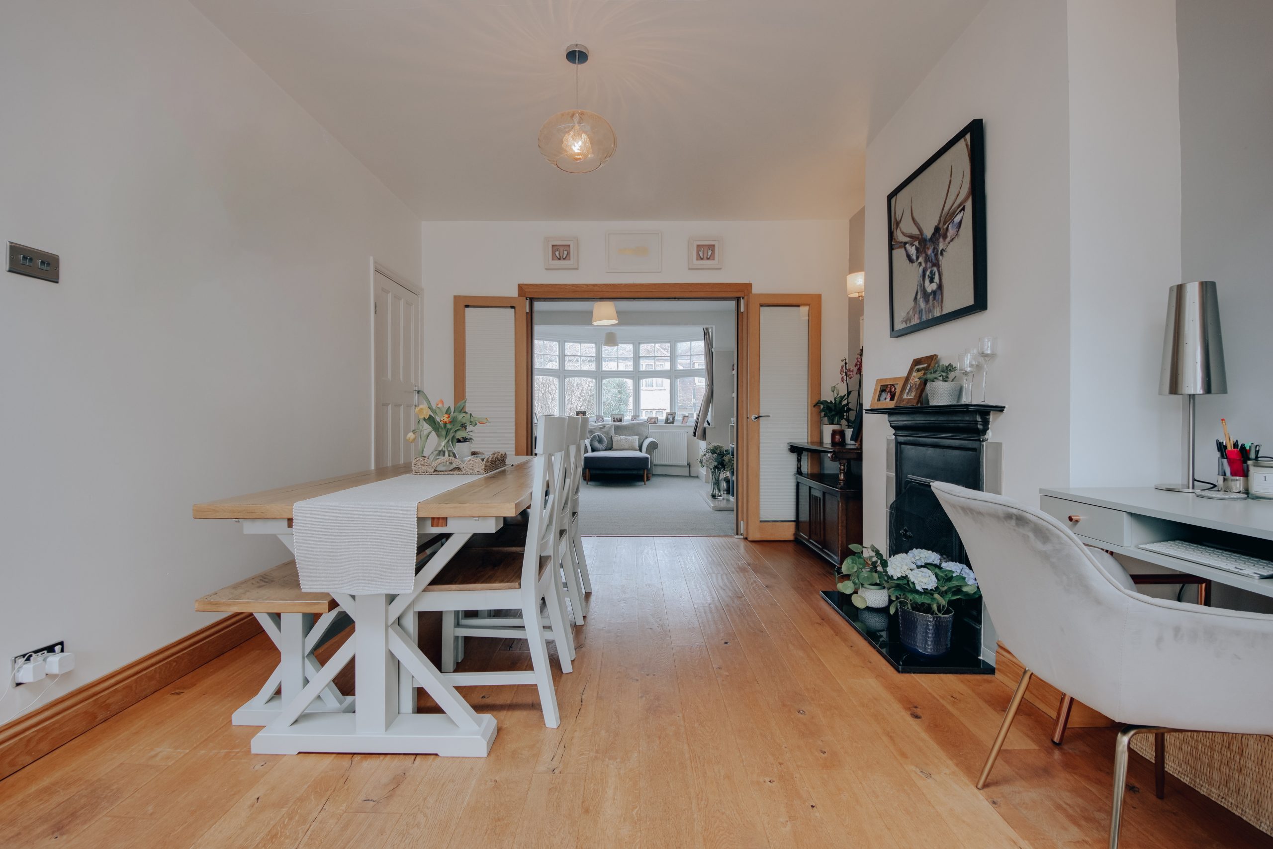 The front door unveils a beautifully bright hallway adorned with Amtico vinyl flooring in a charming parquet pattern - an inviting space for greetings, accompanied by the convenience of a practical downstairs cloakroom on the left-hand side. Commanding attention on the ground floor is the expansive 28’ x 15’ open-plan kitchen and dining space, where a Leisure Cookmaster becomes an immediate focal point, stylistically nestled within a refined white tiled surround. Across the room, a striking green feature wall delineates the dining area, complemented by an exposed log-burner with a stainless steel-lined chimney, infusing the space with cozy charm. Sliding doors usher in natural light and provide seamless access to the rear garden, stretching over 100 feet. Infusing the home with personality, the current owners have introduced statement furniture, such as bold pink cabinetry, only enhancing the property’s unique character. Completing the ground floor is a practical utility room and a tranquil, 15ft living room positioned at the front of the plan. Enhanced by a generous window adorned with bright-white shutters and reinstated cornicing, this area offers an ideal setting for cherished evenings spent with family and friends.